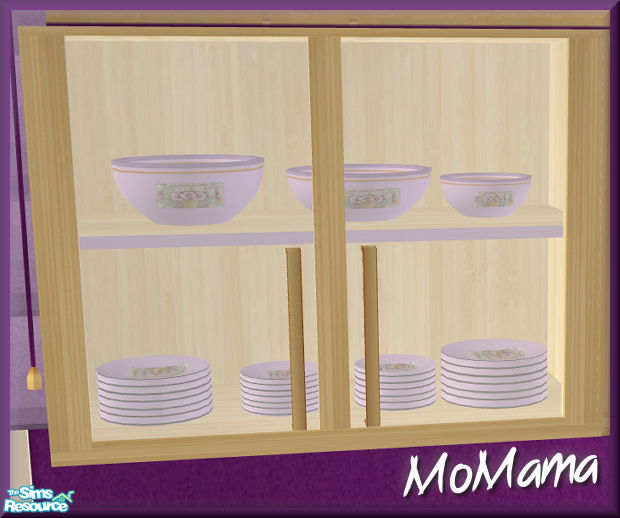 Bamboo cabinet with glass doors and bronze fixtures containing lavender plates and bowls.