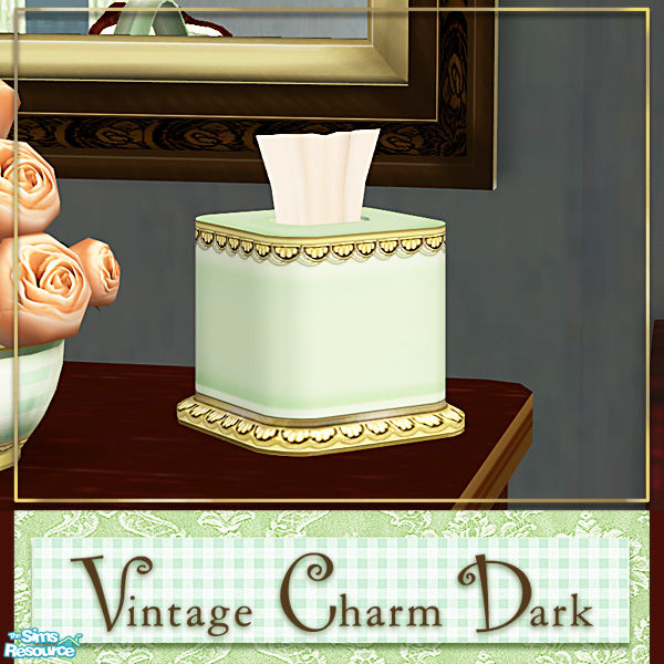 Vintage Charm Dark is a set recolor of my Vintage Charm Bed & Bath sets. VC Dark features, rich, dark, wood tones, a soft mixture of green & blue textures, with a colorful dash of apricot. VC Dark features 4 new meshes: lantern table lamp, 2-post table lamp, end table, and a 1950\'s alarm clock.