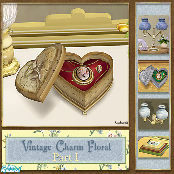 Vintage Charm Floral Part I, features a sunny floral print and new meshes, 3 bed meshes, a wall unit, table lamp, and a jewel box with a cameo necklace and ring. Vintage Charm floral also marks my 4th anniversary with TSR. Thanks Everyone and Happy Simming!!!