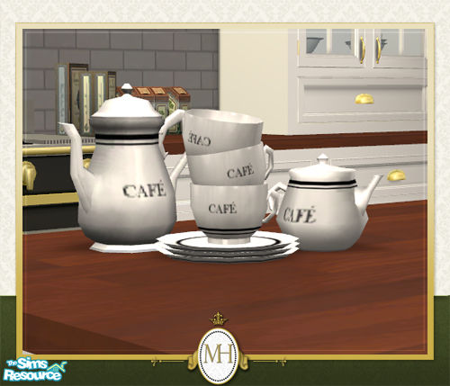 A recolor of the MH Kitchen dishes in a simple cafe theme. Also recolors all dishes in MH Kitchen upper cabinets.