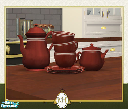 A red and white recolor of the MH Kitchen dishes. Also recolors all dishes in MH Kitchen upper cabinets.