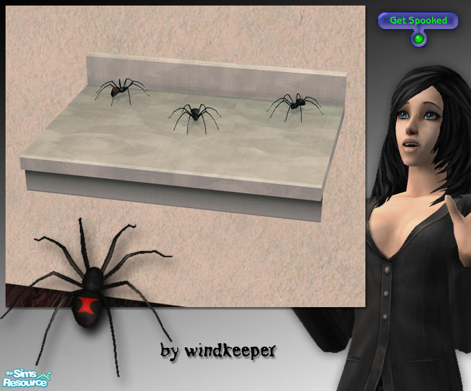 Decorative Black Widow spider with new interaction. Direct your sims to "Get Spooked" and watch them scream with fear! Fun and bladder motives will drop. OFB shelves compatible. Catalog location: decor-misc. Placement: surface.