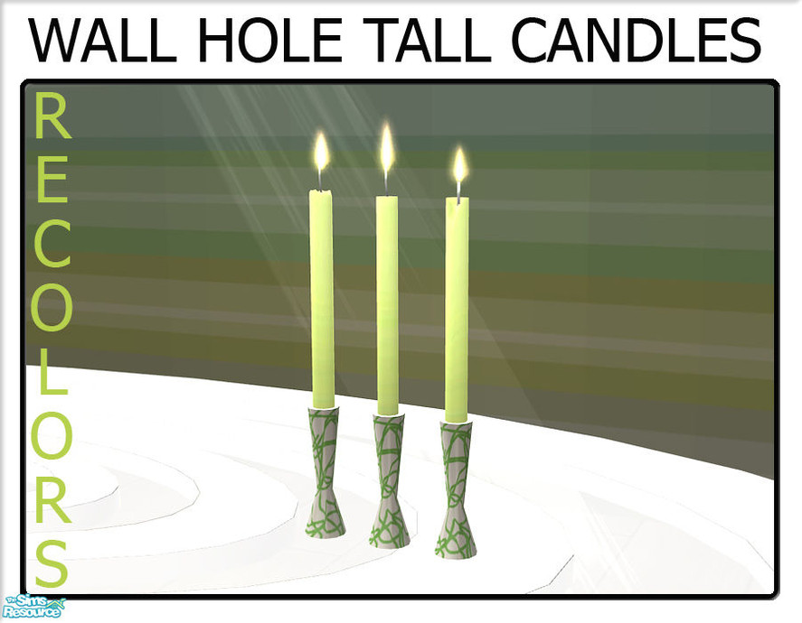 A set of recolors of my tall candles from my wall hole knick knack set. Use it on the Wall Hole shelf or just for general decorative use ;)