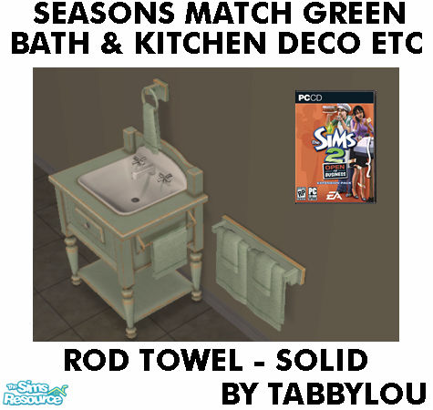 Recolor of Towel ONLY - solid - for the Towel On Wooden Rod in SM Green Bath Kitchen Deco items to match the Seasons ingame Country Green items and my recolors of SM items. Requires OFB EP. Enjoy! *recolors towel for rod and ring*