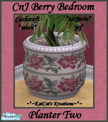 Recolor of Cashcraft\'s \"Vintage Charm Bedroom - Planter Mesh\" using textures from jsf\'s \"jsf Designs Beaded marble Stripes2\" & \"jsf DesignsBerryToile&Floral\" wallpaper. Part of my \"CnJ Berry Bedroom\" set. ADDITIONAL: Potted plants can be placed inside without the use of a cheat.