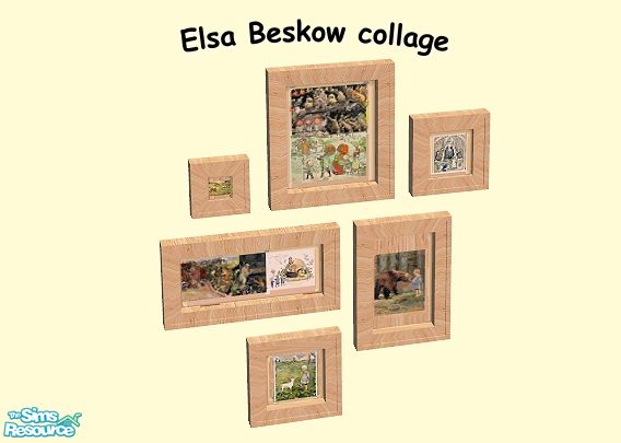 collage with Elsa Beskow art in light wood frames