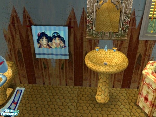 Thanks to Disney: Adults enjoy fantasy too:9 items, 2 walls, 1 floor:towel,blinds, combo shower, hot tub, lounge chair, shower, sink, toilet, toilet mat