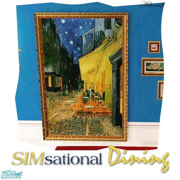 Dark wood diningroom furniture, paired with vivid blues, makes for "SIMsational Dining." Good food, good friends and a simsational time!