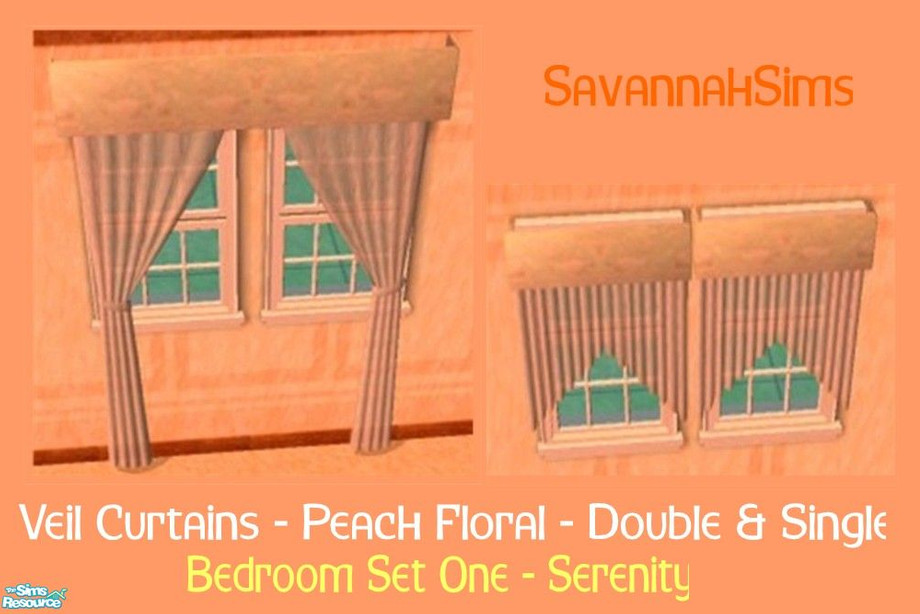 Enjoy a sense of calm with the Serenity Bedroom Set, including it's very own en-suite bathroom and dressing room! Everything matches, enabling your Sims to feel calm and content with the flow of these three attached rooms. This part of the set is the Veil Curtains (Double & Single) Peach Floral. Same file. Happy Simming! TSRAA Creation.