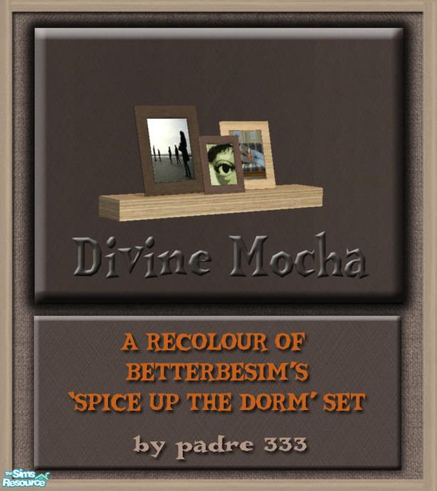A dorm set in mocha brown with light wood and a tiny splash of blue and chocolate to soften. A recolour of the amazing (!) "Spice Up The Dorm" set by the oh-so-brilliant BetterbeSim! A collection of photos by Padre 333