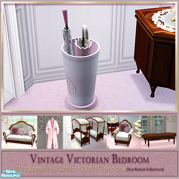 Vintage Victorian Bedroom Part III, "Add-ons" set includes 6 New Meshes, and several Object Recolors. The Add-ons set features: a loveseat, armchair, coffee table, decorative dressing gown, 4 post single bed, single bed canopy and more...