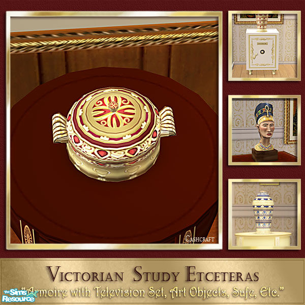 Etceteras, additional furnishings and decorative pieces for the Victorian Inspired Study sets. The set features a vintage armoire with television set, vintage safe, bust of Queen Nefertiti, antique urn, decorative covered bowl, etc.