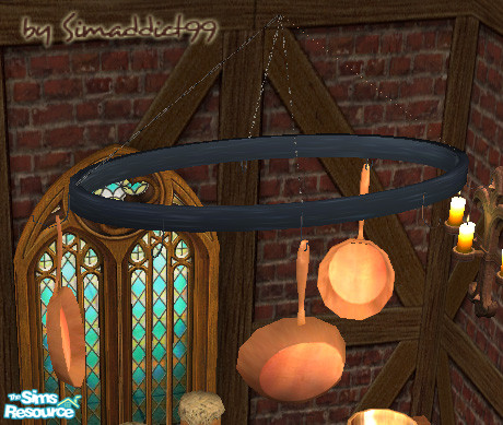 wrought iron medieval pot rack with copper pots/pans.