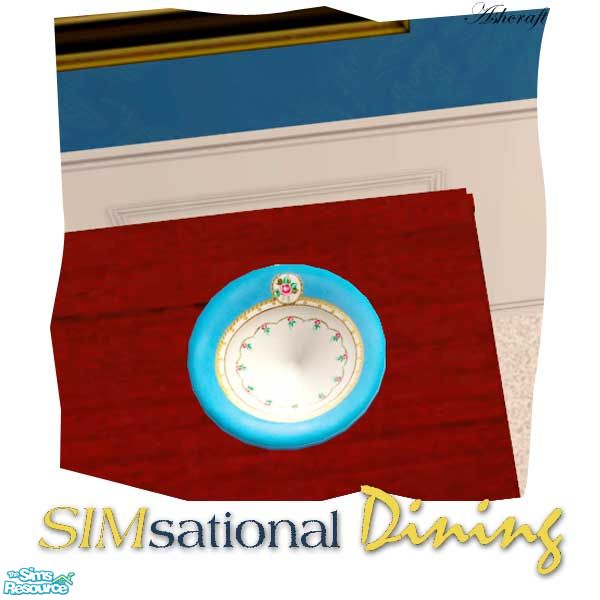 Dark wood diningroom furniture, paired with vivid blues, makes for "SIMsational Dining." Good food, good friends and a simsational time!
