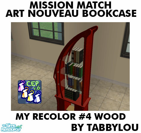 My Recolor #4 Wood of Novellas Nouveau BookCase Mission Match recolors for the rest of the wood I will be doing in object sets. One object, all wood etc recolors. The Black & White recolors have already been done. See individual items for requirements. Requires CEP. Enjoy!