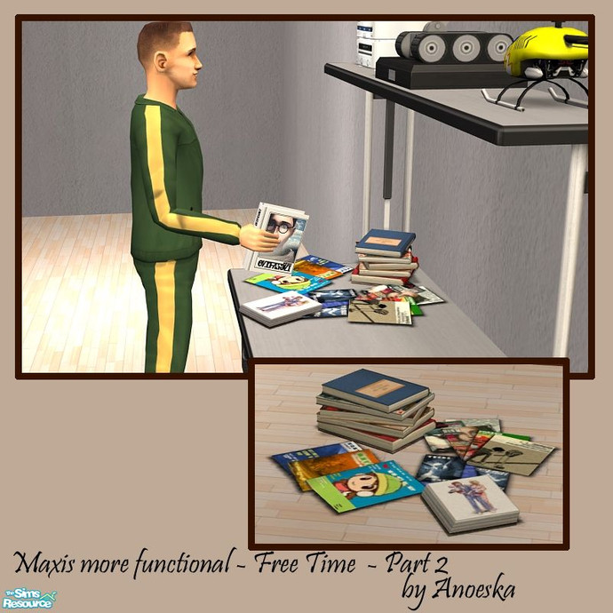 The Free Time decorative books as real usable books (bookcase). Can be placed on all kinds of surfaces or on the ground. You will find this under bookcases. The original file with only the look at function is still under decorative objects.