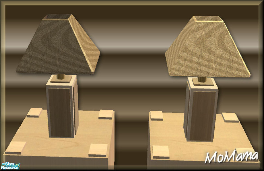 A wavy lampshade of Brown on a dark matching wood base with lighter trim.