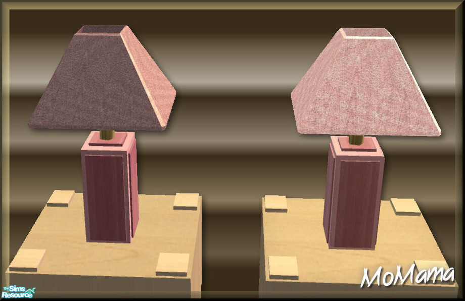 A wavy lampshade of Dusty Pink on a dark matching wood base with lighter trim.