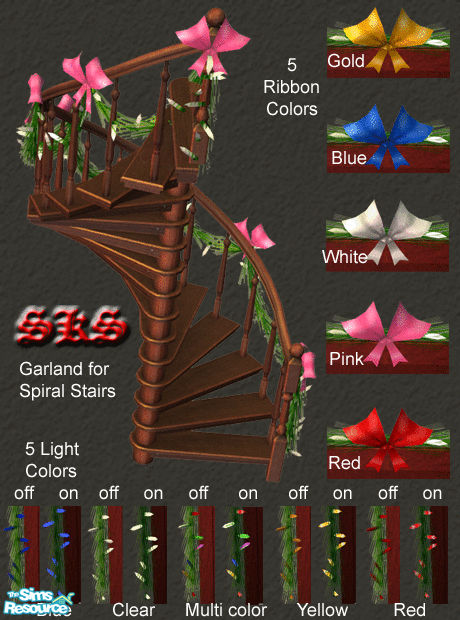 Decorate your Sims homes for Christmas with this festive garland for Spiral stairs. It drapes gracefully from large festive bows on the railing, & Lights up at night (but adds no ambient light). 5 interchangable bow and light colors to choose from. Merry Christmas! Cataloged: lighting/other By: SKS