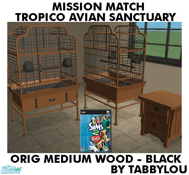 Maxis Original Medium Wood with Black Accents for Recolors of the Tropico Avian Sanctuary \"Bird Cage\" in the Mission OFB woods and my wood recolors. Shown with recolors of the end tables to show color match. Mix & Match with all my MM recolor sets. Requires Pets EP. Enjoy!