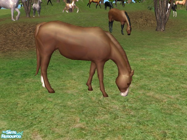 Grazing mare for your sims farm yard. Base mesh is the brown horse with black mane, tail and stockings. Grazing mare can be found under sculptures. Can be used with or without either EP.
