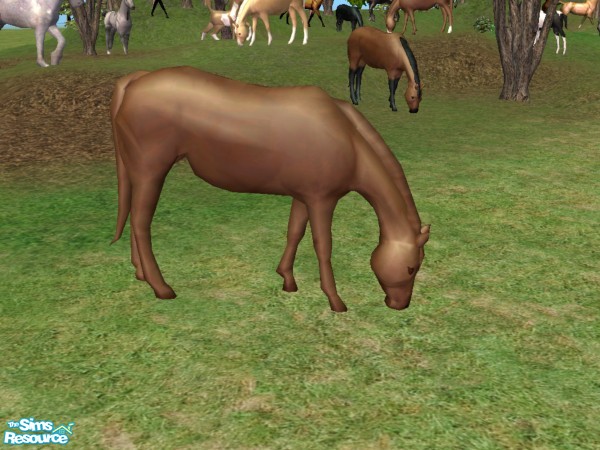 Grazing mare for your sims farm yard. Base mesh is the brown horse with black mane, tail and stockings. Grazing mare can be found under sculptures. Can be used with or without either EP.