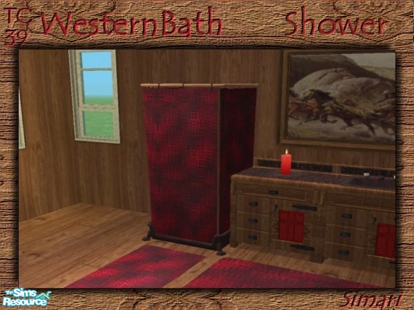 Shower with black and red marbled floor, cherry wood frame and red and black plaid curtain. Compliments the TC39 Western Bath.