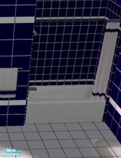 Navy blue tile tub stall with contrasting shower curtain. Part of the Navy Bathroom.