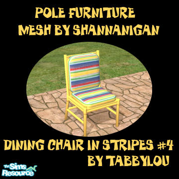 Recolor of Shannanigan's Pole Furniture Dining Chair in Stripes & Metal (won't rust, peel, fade, chip, etc). This is Stripes #4 Recolor. Enjoy! Make sure you get her meshes so these show up in your game.