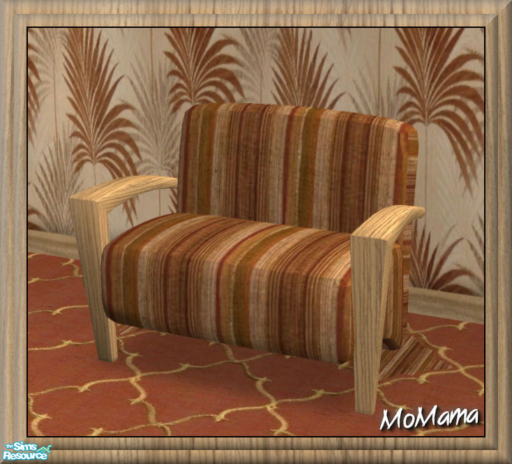 A relaxing arm chair of zebra wood with a textured stripe cushion.