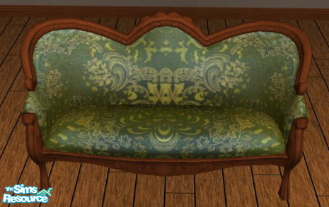 The luxuriare loveseat from the base game in reddish wood and green floral fabric.
