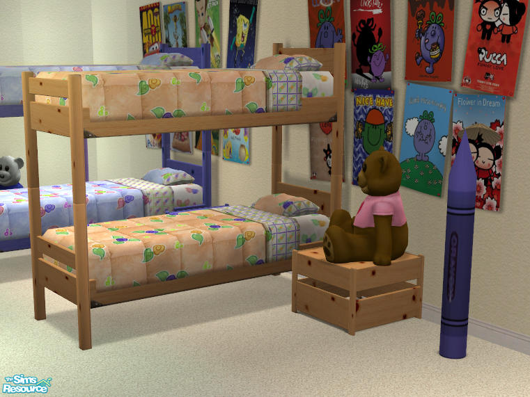 Crayon Colors. Bunk Coffee End Table LgtWood Bunkbeds (top bunk decoration) and coffee table in-game matching colors, crayon floor lamp, posters. Sims 2 by DOT of The Sims Resource.
