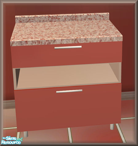 A drawer and cupboard surround an open shelf in this nice counter in coral and cream with a nice granite blended counter top.