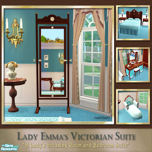 Lady Emma's suite is a set recolor of Lady Roslyn's Victorian Suite. Lady Emma's suite features dark wood furniture, textured fabrics and shades of turquoise.