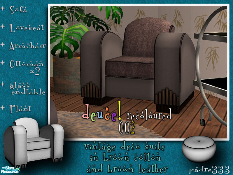 Deuce! in vintage brown leather backing and seats with a hard wearing cotton around the frame. Durable and cool with a distinctive Deco feel!! Made with Pets EP installed, therefore Pets may be required. You must download the meshes for these to work in game. And please don't clone, redistribute or republish. Thanks and above all, dig it!!