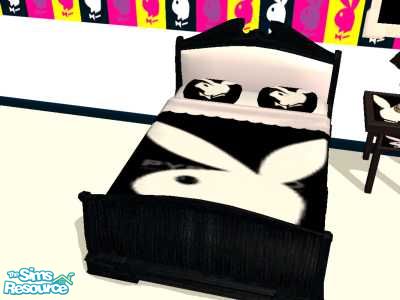The bedframe is black with a white cushion headboard and white nad black bedding with a white playboy bunny on the pillow cases and duvet cover.