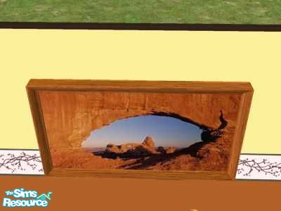 A rock arch picture with a caramel wood frame.