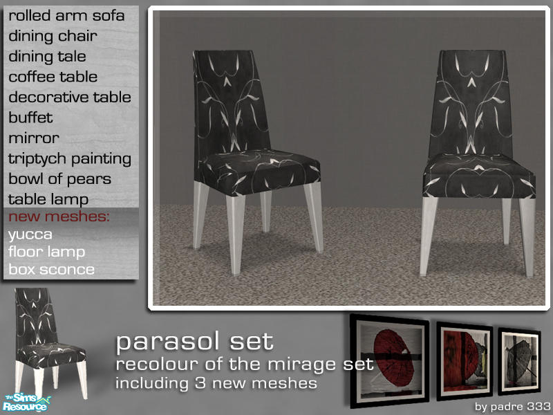 A dining room/living area in worn grey timber with black velvet seating for your Sims. Recolour of the Mirage Diningroom set *including 3 new meshes*. Enjoy.