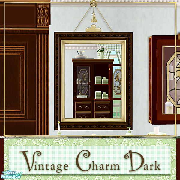 Vintage Charm Dark is a set recolor of my Vintage Charm Bed & Bath sets. VC Dark features, rich, dark, wood tones, a soft mixture of green & blue textures, with a colorful dash of apricot. VC Dark features 4 new meshes: lantern table lamp, 2-post table lamp, end table, and a 1950\'s alarm clock.