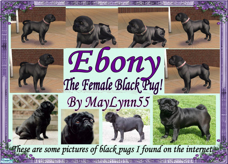 I was not impressed with the Pug breed in the Pets choices so I have created a Black colored Female Pug. I named this adorable little Pug Ebony. Her preview picture comes with some photos of real black pugs!