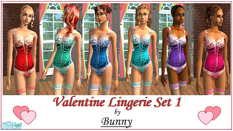 Especially for Valentine\'s Day, a set of sumptuous corsets in vivid shades of satin trimmed with lace, with jewelled heart buckles on straps. Worn with matching panties and luxurious lace top hold-up stockings. For adults and young adults. Maxis mesh. Base game compatible. Maternity friendly.