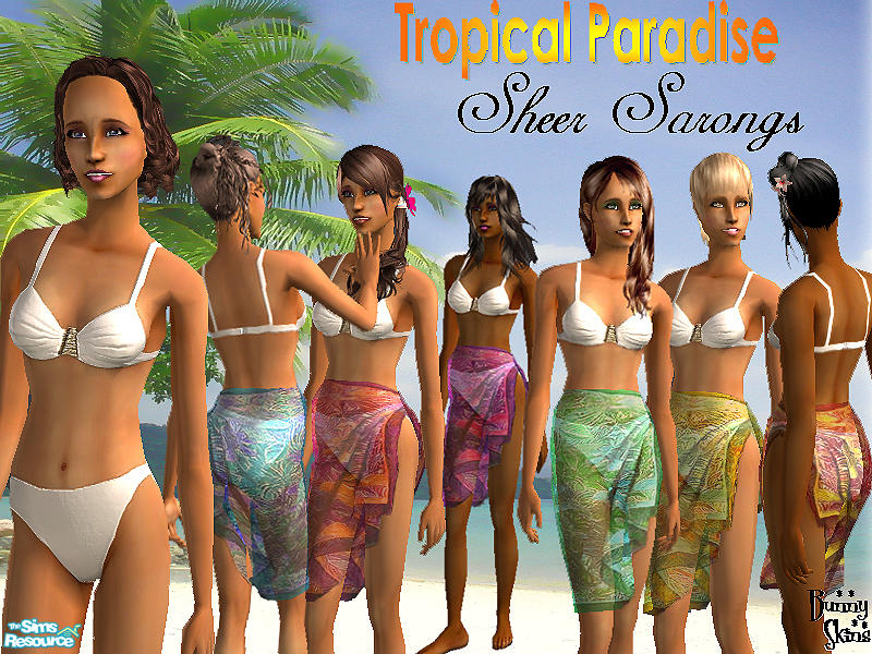 Created for the Tropical Paradise Theme Week, a set of sexy sheer sarongs in colourful jungle print, worn over an elegant white bikini with sparkling jewelled brooch detail. For adults and young adults. Alpha nachthemd 300306 mesh by Biene (included).