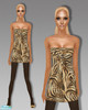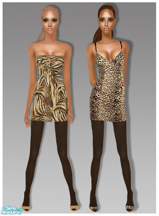 A leopard print dress with black tights and matching heels and a strapless tiger print dress with black tights and gold heels. Both require mesh #16 from Glamorous Lounge.