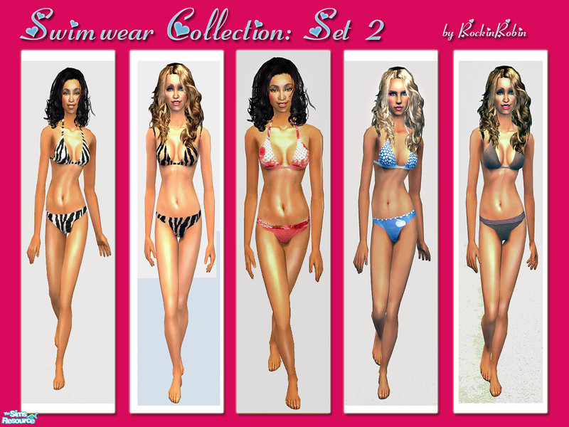 Get your Sims ladies ready for the long hot summer with these sexy bikinis. These are recolors of the Maxis swimsuit, so no custom mesh is needed. Enjoy!