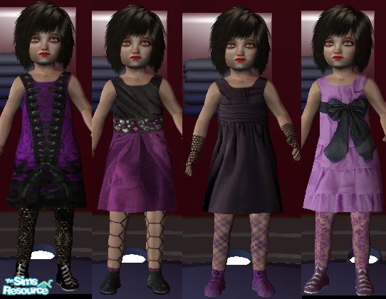 Four dresses for your everyday toddler sims. purple corset-like dress, purple and black with a sequin belt, deep purple prom-type and light puple layered dress with black bow