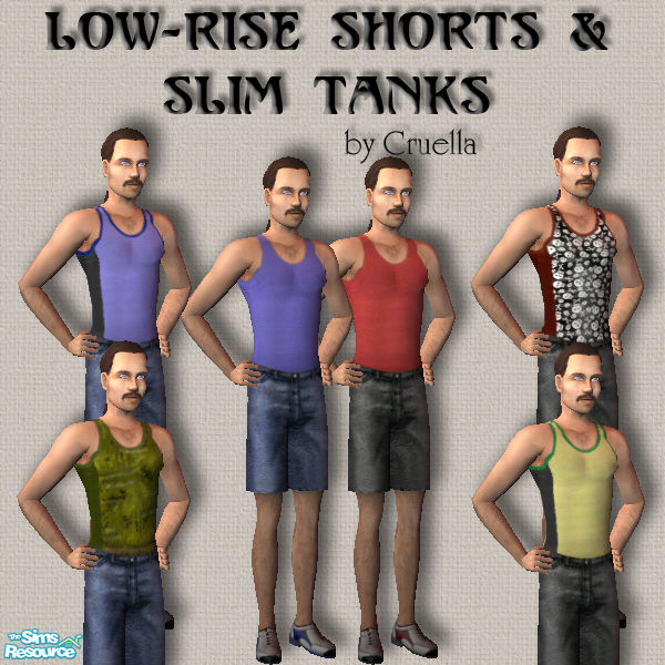 These low-rise jean shorts fit nice below the waist. You will need the 6 different "Slim Tanks" that I made longer to fit below the waist band of the shorts. The regular shirts will ride up above the waist. The Slim Tanks will still work normally with all the other styles of pants and shorts.