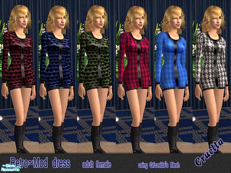 Cute and trendy is this retro-mod style mini dress. Great for that special blind date. Looks like the 60's design but with modern wool fabric and leather trim. You need to download Mesh_lcmminiboots051205 by Grizzelda.