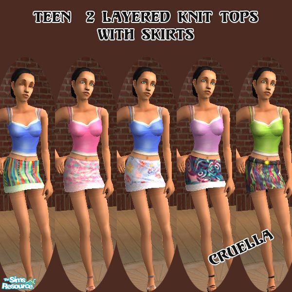 Your Sims Teen will love these two-in-one knit tops, in four lovely light shades with coordinating multi-colored skirts.