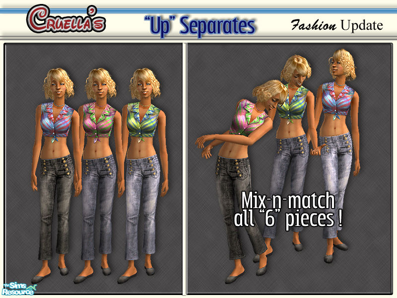 ~~~ UPDATED: am_uppant_01,02,03. (denim capris) (Ooops!) this fixes the funky looking capris skin that shows up in the game. Sorry. Please re-download -the pant only- for the fix. Thanx for your patience. ~~~ Summer vacation separates. Tie blouses and denim capris.