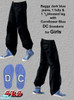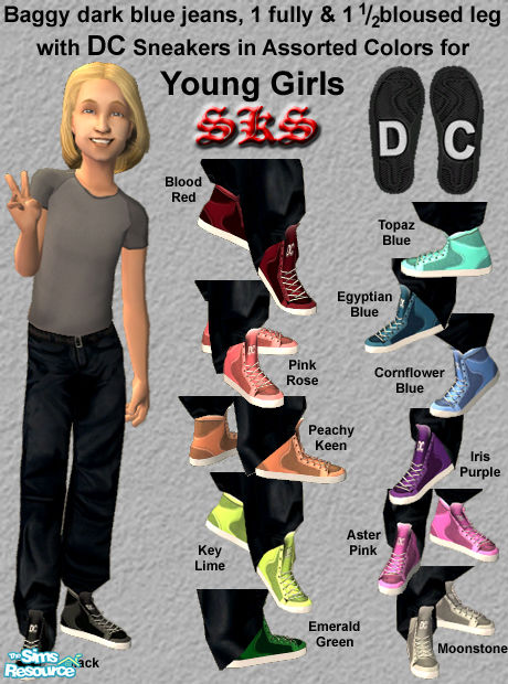 Baggy jeans in midnight blue with DC sneakers in 12 colors. Pants have left leg bloused and right leg 1/2 bloused. Sneakers have over long toung and are laced 1/2 way up, bows are hidden (neetly tucked away). Great for cool kids of all kinds. By SKS